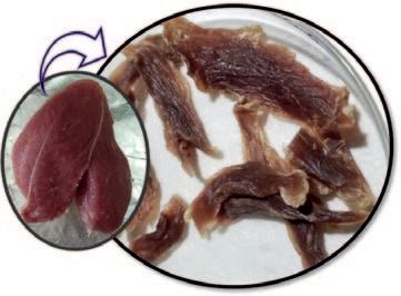 Por lo tanto, con el objetivo de desarrollar un snack cárnico a base de carne ovina, reducido en sodio, nos propusimos estudiar aquellas condicio nes que permitan deshidratar a la carne fresca, previamente marinada. El desafío es lograr mini mizar el contenido de sodio, aproximando a la concentración mínima requerida para ejercer la función tecnológica, y combinarlos con procesos de deshidratación que logren un producto cárnico estable a temperatura ambiente. En el Centro de Investigaciones y Transferencia de Río Negro (CIT –UNRN) estamos realizando los ensayos de labora torio para poder lograr el objetivo mencionado y obtener condiciones de proceso estandarizadas para el desarrollo del nuevo producto. Los prime ros ensayos realizados arrojaron que es posible obtener un producto cárnico marinado con cloru ro de sodio al 0,8% y deshidratado en estufa de convección forzada, el cual aporta un 56% de pro teínas. Es importante destacar que los productos cárnicos son comúnmente marinados en salmue ras de 2,0% de cloruro de sodio. Los resultados hasta ahora obtenidos son alentadores para la búsqueda de aquellas relaciones entre concentra ción de salmuera y secado que permitan obtener un producto estable a temperatura ambiente, con un perfil nutricional saludable y con característi cas organolépticas aceptables, y que también agregue valor a la cadena de valor ovina y fomente su consumo.