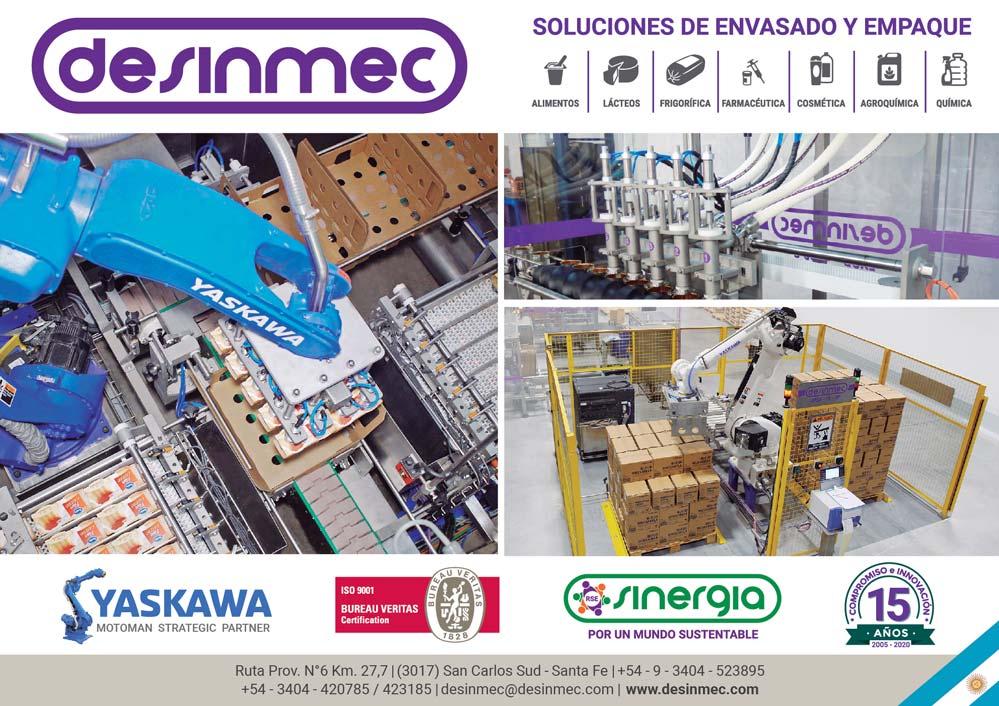 Los equipos de Desinmec compiten con los mejores del exterior… Habitualmente desarrollamos soluciones a medida. En algunas gamas de producto competimos con empresas locales, pero en general competimos con empresas europeas. Para mí es un orgullo que en la Argentina podamos hacer cosas de calidad internacional. Las empresas lácteas son nuestros principales clientes de sistemas y máquinas para envasado, pero también fabricamos equipos para otras industrias de alimentos, para agroquímica, para cosmética, puntas de línea para frigoríficos, etc. Y dentro de la gama de máquinas de envasado, también tenemos las de empaque automático y de paletizado automático, e incorporamos a través de convenios con otras empresas la envoltura de pallets, de tal manera de poder entregar el pallet terminado, listo para entrar a cámara. Trabajamos en proyectos de diferente envergadura, es muy amplio el rango de equipos que se pueden hacer. Estamos exportando, cerramos dos contratos en Brasil, estamos enviando equipos a Paraguay y ya son siete países a los cuales llegamos con nuestros equipos, incluso hasta Centroamérica.