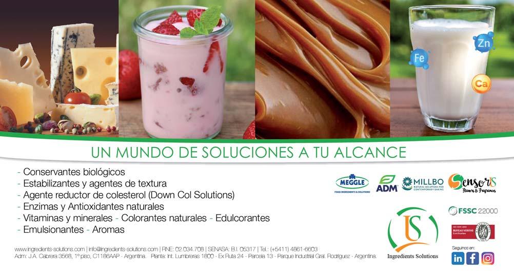 Evolución de la cadena láctea en la Argentina Período 2000-2021 M.C. Paollili, J. Mattera, S.M. Cabrini, F.A. Fillat, L.O. Pagliaricci 26 40 MERCADOS La importancia de Ucrania y la Federación de Rusia para los mercados agrícolas mundiales La FAO analiza los riesgos asociados con la guerra en Ucrania 34 SEGURIDAD ALIMENTARIA STAFFÍNDICE DE ANUNCIANTES DIRECTOR Néstor E. Galibert DIRECTORA EDITORIAL: Prof. Ana María Galibert RELAC. INTERNAC.: M. Cristina Galibert DIRECCIÓN TÉCNICA: M.V. Néstor Galibert (h) DIRECCIÓN, REDACCIÓN Y ADM. Av. Honorio Pueyrredón 550 - Piso 1 (1405) CABA - ARGENTINA Tel.: 54-11-6009-3067 info@publitec.com.ar http://www.publitec.com.ar C.U.I.T. N° 30-51955403-4 Esta revista es propiedad de Publitec S.A.E.C.Y.M. Propiedad Intelectual: 104936403 IMPRESIÓN GRÁFICA PINTER S.A. Diógenes Taborda 48/50 (C1437EFB) C.A.B.A. / Tel./Fax: (54-11) 4911-1661 graficapinter@graficapinter.com.ar Visite nuestras revistas on-line: www.publitec.com.ar Publitec es miembro JULIO 2022 ALPHA QUÍMICA35 ASEMA43 BIACONSULTCT BISIGNANO1 BUSCH28 CHR. HANSEN15 DIAGRAMMA11 DESINMEC14 FITHEP CENTRO 2023RCT FRÍO RAF39 HIDROBIOTRT ING. LÓPEZ29 INGREDIENTS SOLUTIONS21 KUAL25 MEDIGLOVET SIMES39 SSM53 TESTO37 VMC14 Proyecciones a mediano plazo para los mercados lácteos mundiales Las perspectivas son optimistas, pero hay desafíos para adaptarse a las preferencias cambiantes de los consumidores
