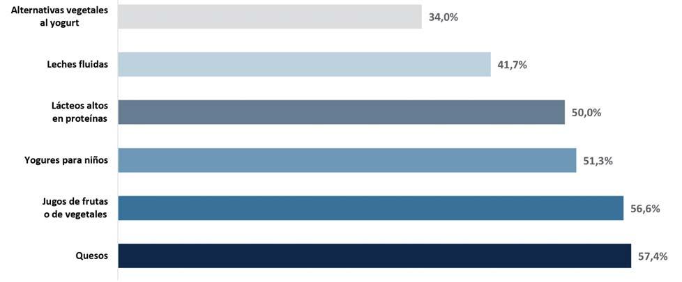 La aceptación de los alimentos y bebidas con probióticos abarca una variedad de productos lácteos, alternativas de base vegetal y jugos. Si bien los alimentos lácteos son la opción preferida y más frecuente para el 63% de los encuestados, también se pudo observar que existe un interés por consumir probióticos en otros tipos de alimentos si estuvieran disponibles, tales como el queso, los jugos de frutas o de vegetales, los yogures para niños, los lácteos con alto contenido de proteína, las leches fluidas y las alternativas vegetales al yogur (Gráfico 3).