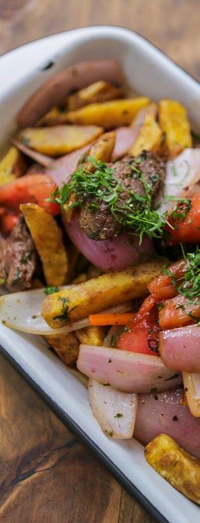 El lomo saltado, ícono indiscutible de la gastronomía peruana, se presenta con jugosos trozos de lomo, cebolla, tomate y salsa de soya, acompañados de papas fritas amarillas. La jugosidad del plato, con su juego entre lo dulce, lo salado y lo ahumado, se enlaza magistralmente con la elegancia del Malbec. Su paso por boca, con dulzura inicial y un paladar medio firme, sostiene los diversos contrastes de la