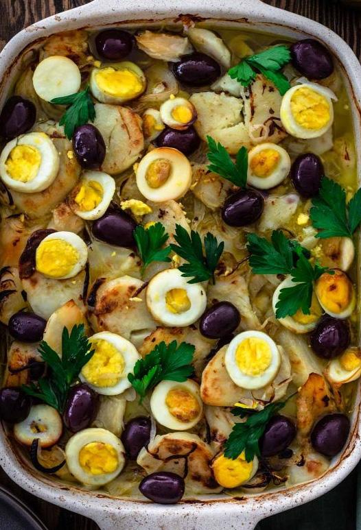 5. Depois de cozidas retire-as da água e coloque-as num tabuleiro, por cima coloque o bacalhau;