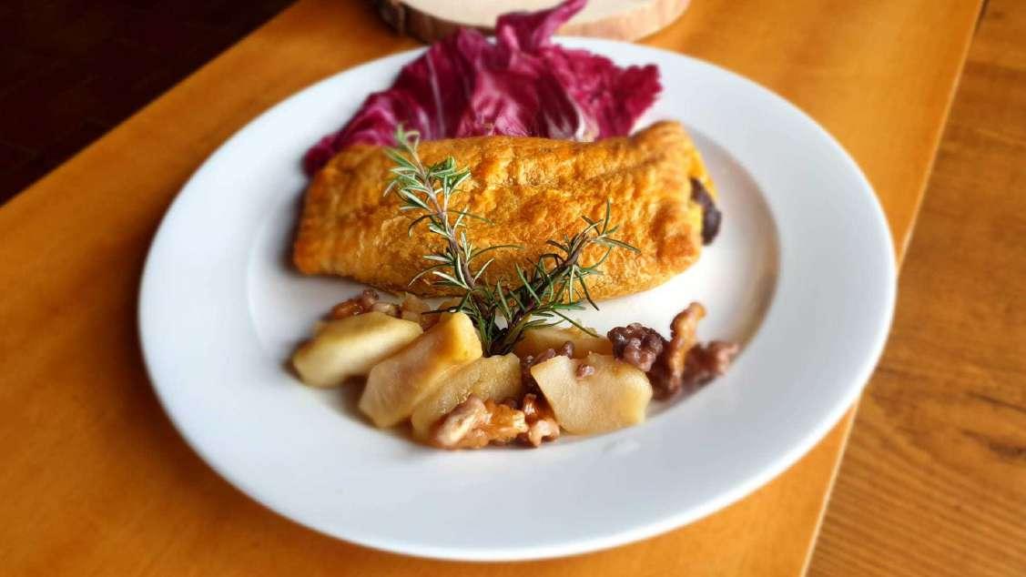 Receita da folhado de lebre com maçã caramelizada e nozes, da autoria do Chef Helder Duarte, da Quinta do Mel