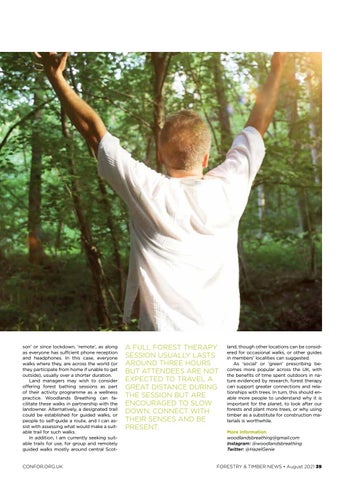 land, though other locations can be considered for occasional walks, or other guides in members’ localities can suggested. As ‘social’ or ‘green’ prescribing becomes more popular across the UK, with the benefits of time spent outdoors in nature evidenced by research, forest therapy can support greater connections and relationships with trees. In turn, this should enable more people to understand why it is important for the planet, to look after our forests and plant more trees, or why using timber as a substitute for construction materials is worthwhile. More information woodlandsbreathing@gmail.com Instagram: @woodlandsbreathing Twitter: @HazelGenie
