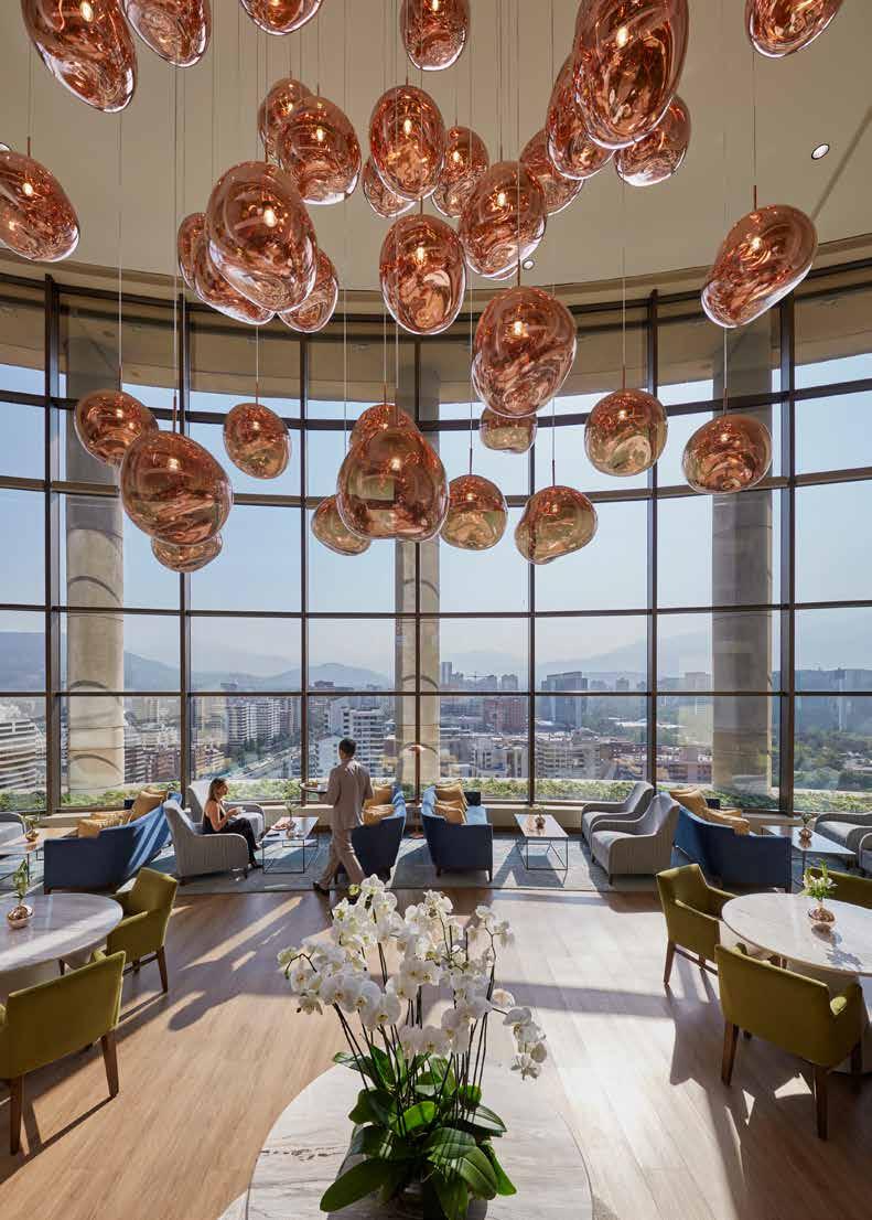 en este territorio donde la ciudad encontró su proyección hacia la modernidad, un lugar en el que avenidas arboladas y edificios corporativos de vidrio convivieron con la presencia imponente de la cordillera. La zona, inicialmente concebida como residencial, experimentó en las últimas décadas una metamorfosis que la convirtió en un polo de negocios, cultura y lujo. La sofisticación que hoy define a Las Condes no surgió de la noche a la mañana, sino de un proceso en el que la arquitectura fue protagonista: cada nuevo edificio trazó la silueta de una urbe que aspiraba a dialogar con el mundo sin perder la majestuosidad de su entorno natural. En ese contexto emergió un edificio que cambiaría para siempre la relación de Santiago con la hospitalidad de alto nivel. Una estructura cilíndrica, mitad concreto y mitad cristal, irrumpió en Vitacura cuando el sector todavía estaba lejos de la densidad urbana actual. Fue concebido con la ambición de convertirse en ícono, en un hito arquitectónico que invitará tanto a locales como a viajeros a contemplar el paisaje desde otra perspectiva. Sus ascensores panorámicos ofrecían una escena inédita: el viajero podía elevarse hacia el cielo mientras la ciudad se desplegaba bajo sus pies y, al fondo, la cordillera se imponía con silenciosa magnificencia. El edificio pronto adquirió una identidad propia. Sus líneas curvadas y su lobby vertical se convirtieron en escenario de encuentros, celebraciones y momentos que marcaron la memoria de generaciones. Más que un hotel, fue un faro urbano, símbolo de un Santiago que se atrevía a mirar más allá de sus límites tradicionales. Ese legado, sin embargo, no quedó inmóvil. El tiempo exigía una nueva mirada, capaz de dialogar con la herencia pero también de proyectarla hacia un futuro donde el lujo se entiende como experiencia integral.