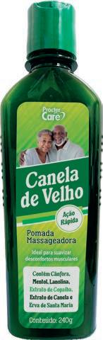 Linha Canela de Velho. Suaviza desconfortos musculares, com ação rápida. Contém cânfora, mentol, lanolina, extrato de copaíba, extrato de canela e erva de Santa Maria.