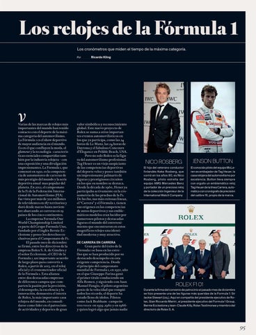 valor simbólico y reconocimiento global. Este nuevo proyecto de Rolex se suma a otros importantes eventos automovilísticos en los que ya participa, como las 24 horas de Le Mans, las 24 horas de Daytona y el fabuloso Concours d’Elegance en Pebble Beach, USA. Pero no solo Rolex es la figura del automovilismo profesional. Tag Heuer es un viejo auspiciante de las competencias deportivas del deporte veloz y posee también un impresionante palmarés de figuras y prestigiosos circuitos en los que su nombre se destaca. Desde la década de 1960, Heuer ya participaba activamente en la cronometría de las pruebas de la F1. De hecho, sus más exitosas líneas, el “Carrera” y el Fórmula 1, tienen sus orígenes en las competencias de autos deportivos y sus emblemáticos modelos eran lucidos por numerosos pilotos y destacadas figuras el mundo del entretenimiento que encontraron en estos magníficos relojes una identidad moderna y muy atractiva.