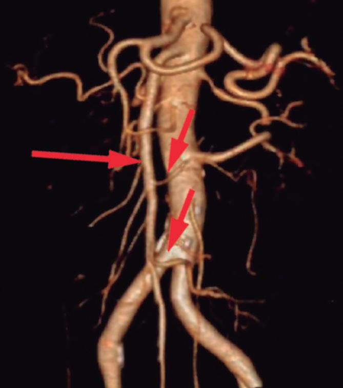 Figure 2. CT angiography of intestinal malrotation showing a superior mesenteric artery with embryonic anatomy. There is a superior mesenteric axis from which small intestinal arteries arise on the right and the right colic vessels on the left. The terminal branch irrigates the small bowel, in contrast to the anatomy of a patient with normal rotation where the terminal branch is the ileocolic artery. Long arrow: superior mesenteric artery. Short arrows: middle colic and ileocolic arteries