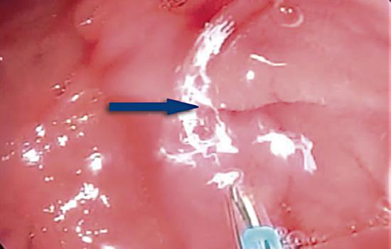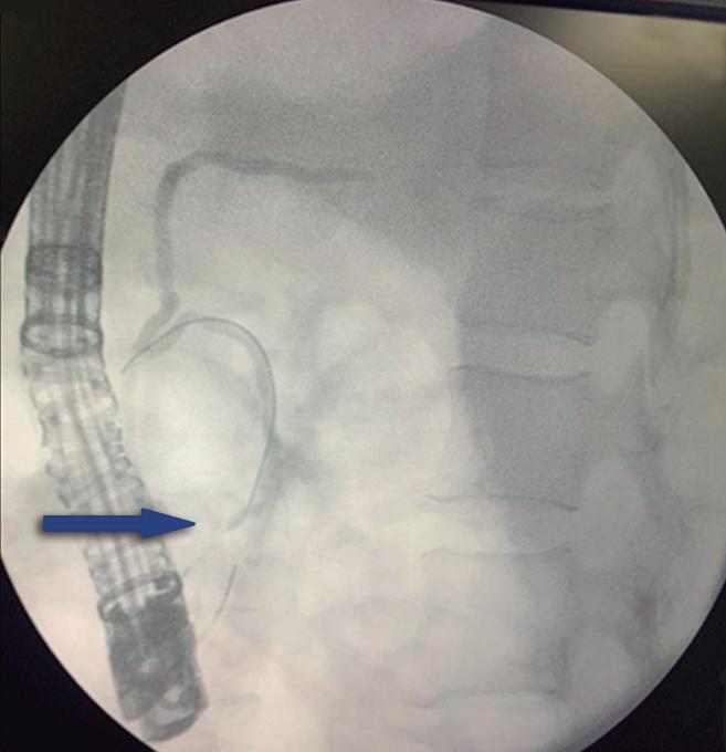 Figura 2. Colangiopancreatografía retrógrada endoscópica en la que al inyectar el medio de contraste a través de la papila mayor, se observa su drenaje por un segundo poro adyacente (flecha azul)
