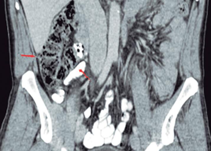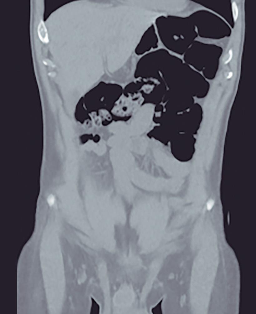 Los síntomas más frecuentes son dolor abdominal asociado a náuseas, vómitos y estreñimiento. Al examen físico se destaca la distensión abdominal.3,4 Al ser síntomas inespecíficos se realizan estudios de imágenes complementarios. Inicialmente se solicita una radiografía simple de abdomen donde se encuentra, como principal hallazgo, dilatación cecal seguida de ausencia de gas en el colon distal, dilatación del intestino delgado y niveles hidroaéreos. Se sugiere complementar con estudio tomográfico5 para confirmar la posición del ciego e identificar la causa que origina la torsión.3 Los hallazgos más importantes en la tomografía computada son la dilatación del ciego, el signo del remolino, el signo del pico de ave, la ausencia de gas en el colon distal y la ingurgitación de los vasos mesentéricos.5 Una vez establecido el diagnóstico, el tratamiento de primera línea es la cirugía para evitar el infarto intestinal, dado que los vasos sanguíneos pueden estar comprometidos por la torsión.3 En nuestro caso, el paciente no necesitó intervención quirúrgica ya que el vólvulo cecal se resolvió espontáneamente, evento muy inusual con pocos reportes de casos publicados previamente.