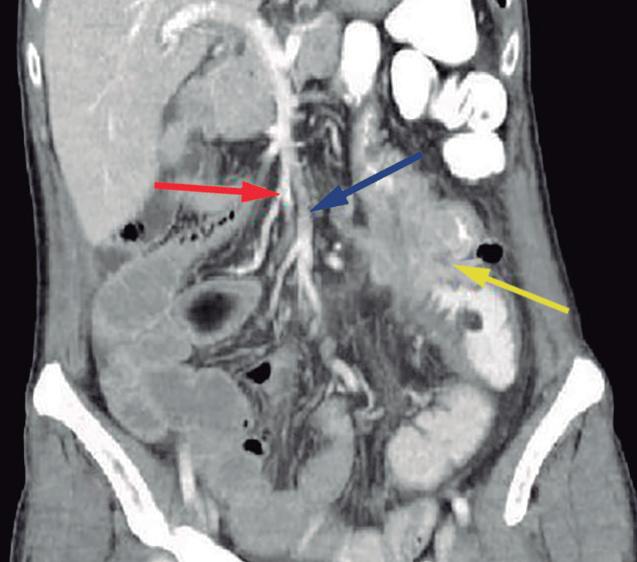 Figure 1. Computed tomography showing intestinal malrotation and right-sided colon cancer. Note the duodenum and small intestine to the right of the midline, the cecum to the left of the midline with a tumor. There is an abnormal disposition of the mesenteric vessels with the superior mesenteric vein anterior and to the left of the superior mesenteric artery. Red arrow: superior mesenteric artery, Blue arrow: superior mesenteric vein, yellow arrow: right colonic tumor