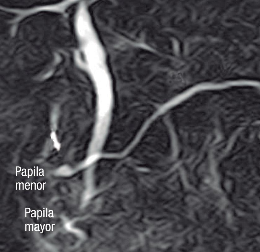 En dicho estudio se observó un conducto pancreático circunferencial en la cabeza del páncreas que rodeaba a la segunda porción duodenal. Al inyectar el medio de contraste a través de la papila mayor, se observó su drenaje por un segundo poro adyacente (Figura 2). Ante la sospecha de páncreas anular, se realizó una colangiopancreatografía por resonancia magnética (CPRM) en la que se encontró un conducto pancreático anular completo (Figura 3). La paciente mejoró parcialmente con tratamiento farmacológico con antiinflamatorios no esteroideos e inhibidores de bomba de protones. Ante la presencia de dolor abdominal recurrente fue remitida a cirugía hepatobiliar. Se realizó una gastroyeyunostomía en Y de Roux. La paciente fue dada de alta a los 5 días del procedimiento. En su seguimiento postoperatorio, a los 30 días, se encontraba asintomática y sin evidencia de complicaciones.