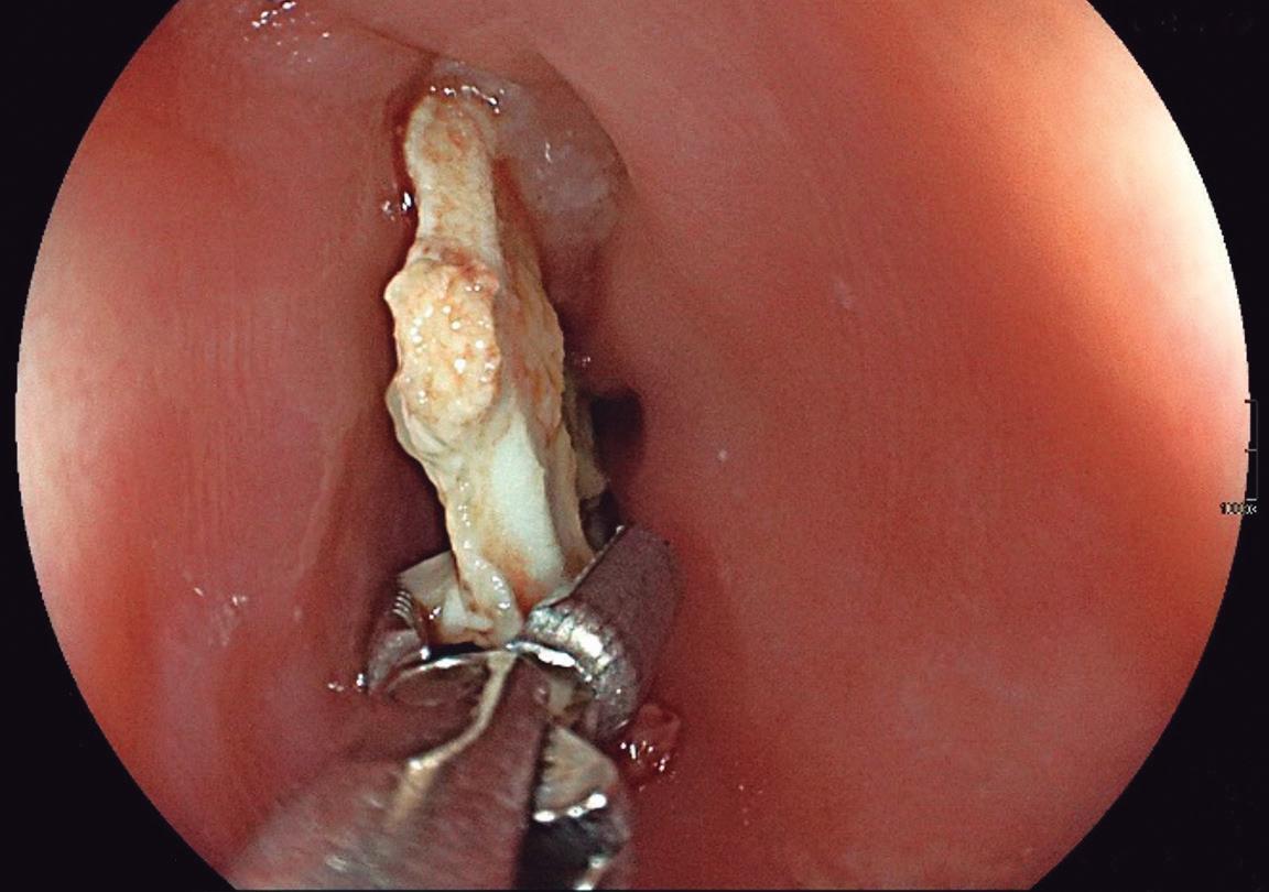 A. Extracción de cuerpo extraño en esófago con pinza. B. Material plástico.