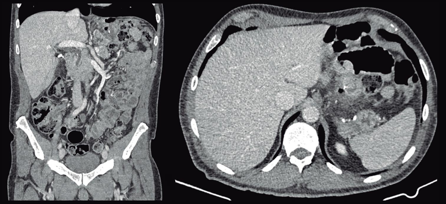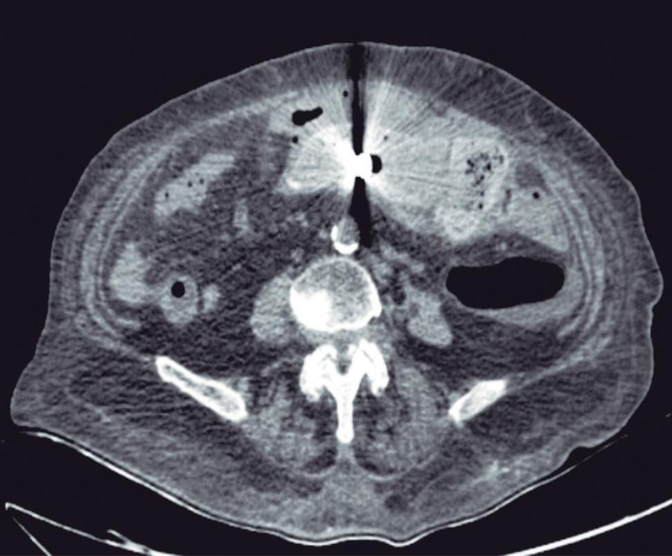 Se realiza una ecografía abdominal que evidencia la presencia de líquido libre. En la TC de tórax y abdomen con contraste oral y endovenoso realizada a continuación se observa un linfocele supraclavicular izquierdo (Figura A), una colección hipodensa perirrenal derecha extendida al espacio periaórtico y presacro y líquido libre perianexial, en las fosas ilíacas y en el espacio de Morrison (Figuras B y C).