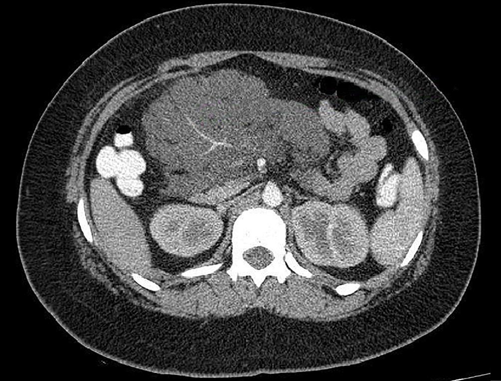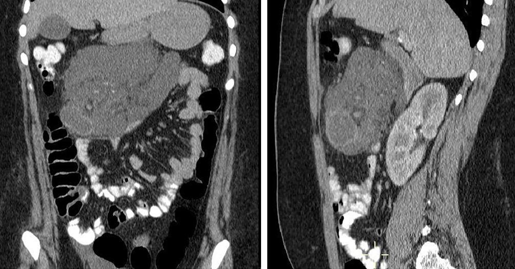 Tras la obtención de las pruebas de imagen, y considerando las características de la lesión, se incluyeron entre los diagnósticos diferenciales diversas lesiones quísticas retroperitoneales. Entre ellas, se planteó el pseudoquiste pancreático; sin embargo, este diagnóstico se descartó debido a que la mayoría de los pseudoquistes se desarrollan como complicación de una pancreatitis aguda o crónica, o bien como consecuencia de un traumatismo pancreático o intervención quirúrgica.¹