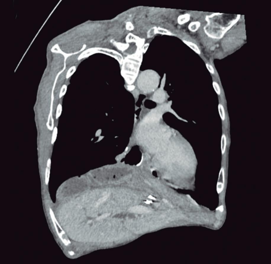 Figura. A) Tomografía computada de tórax, corte axial. Linfocele supraclavicular izquierdo. B) Tomografía computada de abdomen, corte axial. Colección hipodensa perirrenal derecha extendida a espacio periaórtico. C) Tomografía computada de abdomen, corte coronal. Líquido libre en cavidad peritoneal (espacio de Morrison y fosas ilíacas)