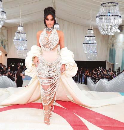 La hermosa influencer, madre de North, Saint, Psalm y Chicago se presentó con un escultural cuerpo en la Met con un vestido de alta cos tura de Schiaparelli, que consistía en un corsét de satén color nude, 16 mil cristales aplicados y 50 mil per las que decoraban la parte del bus to, caderas y piernas. Este delicado vestido fue realizado en más de mil horas de trabajo.