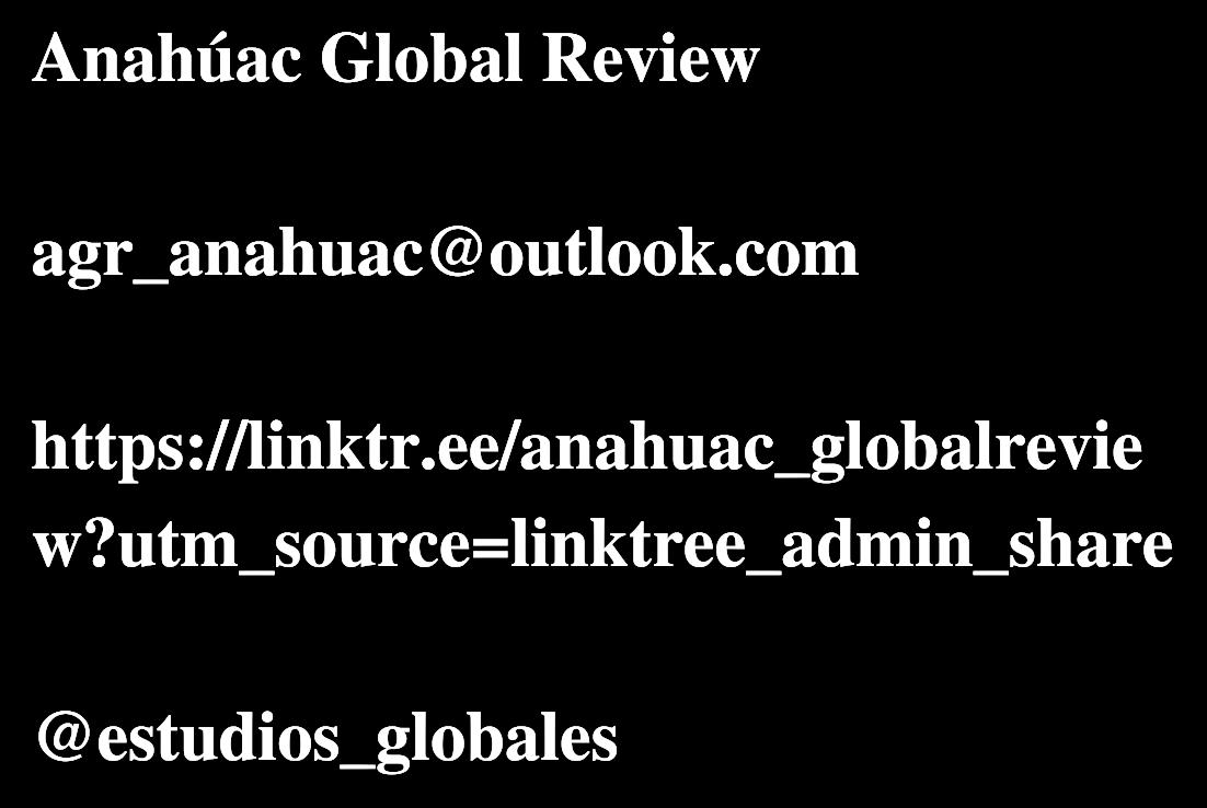 La Edición 33° de Anáhuac Global Review nos invita a todos los lectores a reflexionar sobre la realidad en la que coexistimos Analizar los avances tecnológicos y sus implicaciones geopolíticas, así como hacer conciencia sobre las diversas adversidades que enfrentan las personas alrededor del mundo día con día Buscando apelar al diálogo y permitir que desde nuestras propias posibilidades podamos hacer el cambio positivo que necesitamos. De parte de la Dirección general y de todo el cuerpo editorial, deseamos que esta revista sea de su agrado y que les permita expandir su panorama respecto a los asuntos internacionales que nos competen no solo como internacionalistas, pero también como ciudadanos de un mundo cada vez más globalizado e interconectado.