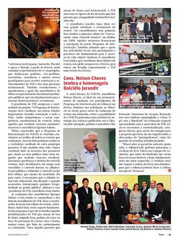 O atual decano do TCE-PA, conselheiro Nelson Chaves, ao final do seu pronunciamento de saudação aos participantes do Programa de Interiorização do tribunal em Breves, lembrou sua solicitação ao Plenário da Corte, pouco antes da realização do evento em Santarém, sobre a possibilidade de o TCE-PA patrocinar uma reedição da antologia das crônicas publicadas em O Liberal pelo advogado, político e jornalista Cléo