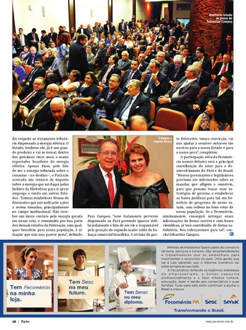 to federativo, temos convicção, vai nos ajudar a resolver entraves tão nocivos para o nosso Estado e para o nosso povo”, completou. A participação ativa da Fecomércio nesses debates será a principal contribuição do setor para o desenvolvimento do Pará e do Brasil. “Nossos governantes e legisladores precisam ser informados sobre as mazelas que afligem o comércio, para que possam traçar suas estratégias de governo e estabelecer as bases jurídicas para tal, em benefício do progresso de nosso estado, com reflexo no bem estar de nossa população. Se a Fecomércio, minimamente, conseguir entregar essas informações de forma correta e com bases científicas, já terá contribuído de forma satisfatória. Nos esforçaremos para tal”, conclui Sebastião Campos.