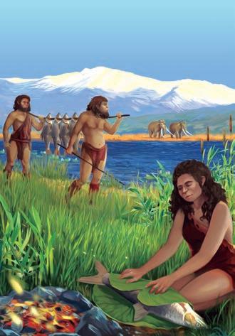 Ilustração de hominídeos explorando e cozinhando Luciobarbus longiceps (barbo grande, Cyprinidae) nas margens do paleo Lago Hula (ilustração de Ella Maru). Crédito: Universidade de Tel Aviv
