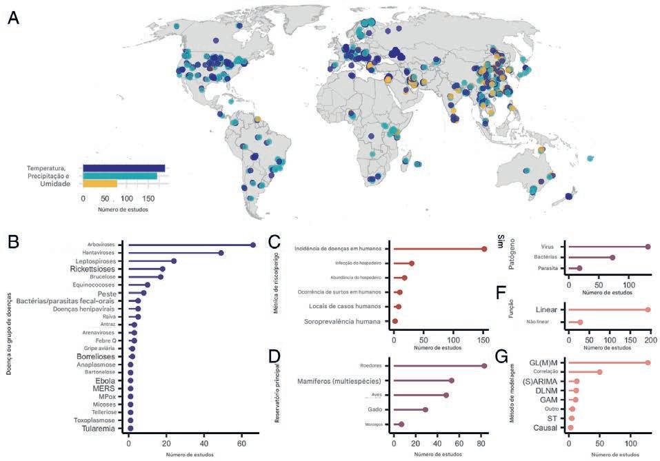 ( A ) Mapa mostrando o banco de dados completo de efeitos climáticos extraídos (n = 852 efeitos, 218 estudos), resumidos geograficamente, com a cor do ponto representando o fator climático e a localização representando a latitude e longitude especificadas ou a localidade nomeada mais próxima do estudo. Estudos sem informações de localidade foram geolocalizados no centroide do país. O gráfico de barras inserido em ( A ) mostra o número de estudos que relatam efeitos da temperatura, precipitação ou umidade em doenças zoonóticas. Os subgráficos mostram o banco de dados dividido por variáveis-chave: ( B ) doença ou grupo amplo de doenças; ( C ) a métrica de risco ou pe-