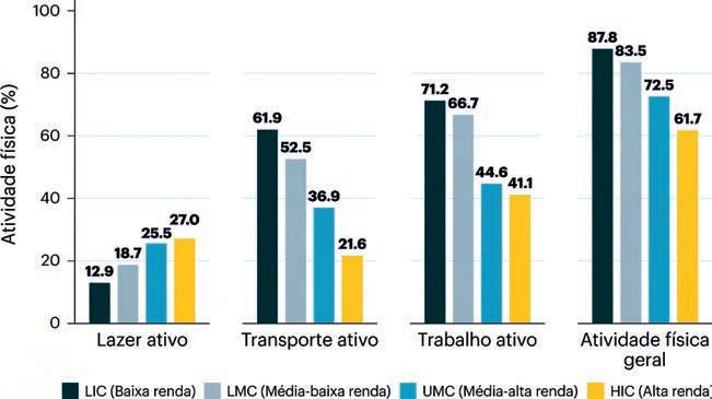 desigualdades persistentes nas formas como as pessoas se exercitam. O acesso ao lazer ativo, como exercícios recreativos — o único tipo de atividade consistentemente motivado pela escolha — foi 40 pontos percentuais maior entre grupos socialmente privilegiados (homens ricos em países de alta renda) do que entre grupos menos privilegiados (mulheres pobres em países de baixa renda).