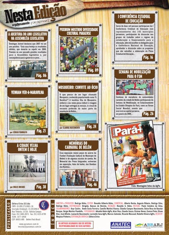 DIRETOR e PRODUTOR: Rodrigo Hühn; EDITOR: Ronaldo Gilberto Hühn; COMERCIAL: Alberto Rocha, Augusto Ribeiro, Rodrigo Silva, Rodrigo Hühn; DISTRIBUIÇÃO: Dirigida, Bancas de Revista; REDAÇÃO: Ronaldo G. Hühn; REVISÃO: Paulo Coimbra da Silva; COLABORADORES: Acyr Castro, Anete Costa Ferreira, Camillo Martins Vianna, Cláudia Campos Nascimento, Dulce Rosa de Bacelar Rocque, Sérgio Martins Pandolfo; FOTOGRAFIAS: Advaldo Nobre AgPa, Artur Dias, Claudio Souza, Elcimar Neves, Eunice Pinto, Eliseu Dias, José Alfinito, Leonardo Nascimento, Lucivaldo Sena AgPa, Marcos Salomão, Ricardo Massoud, Rodolfo Oliveira AgPa; DESKTOP: Mequias Pinheiro; EDITORAÇÃO GRÁFICA: Editora Círios OS ARTIGOS ASSINADOS SÃO DE INTEIRA RESPONSABILIDADE DE SEUS AUTORES
