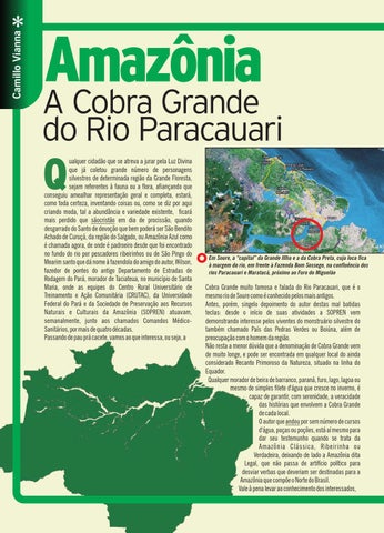 Cobra Grande muito famosa e falada do Rio Paracauari, que é o mesmo rio de Soure como é conhecido pelos mais antigos. Antes, porém, singelo depoimento do autor destas mal batidas teclas: desde o início de suas atividades a SOPREN vem demonstrando interesse pelos viventes do monstruário silvestre do também chamado País das Pedras Verdes ou Boiúna, além de preocupação com o homem da região. Não resta a menor dúvida que a denominação de Cobra Grande vem de muito longe, e pode ser encontrada em qualquer local do ainda considerado Recanto Primoroso da Natureza, situado na linha do Equador. Qualquer morador de beira de barranco, paraná, furo, lago, lagoa ou mesmo de simples filete d'água que cresce no inverno, é capaz de garantir, com serenidade, a veracidade das histórias que envolvem a Cobra Grande de cada local. O autor que andou por sem número de cursos d'água, poças ou poções, está aí mesmo para dar seu testemunho quando se trata da Amazônia Clássica, Ribeirinha ou Verdadeira, deixando de lado a Amazônia dita Legal, que não passa de artifício político para desviar verbas que deveriam ser destinadas para a Amazônia que compõe o Norte do Brasil. Vale à pena levar ao conhecimento dos interessados,