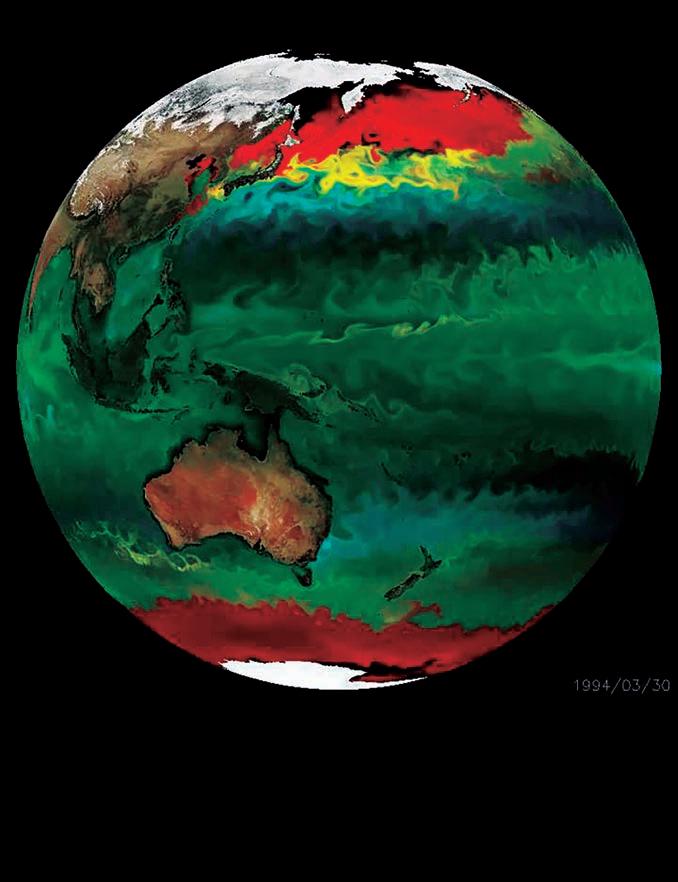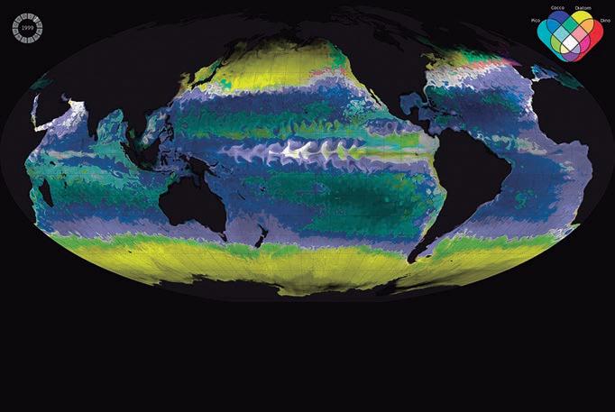 A visualização mostra os tipos dominantes de fitoplâncton de 1994 a 1998, gerados pelo Projeto Darwin, utilizando um modelo oceânico e de ecossistemas de alta resolução. O modelo contém campos de fluxo de 1994 a 1998 (gerados pelo modelo ECCO2), nutrientes inorgânicos, 78 espécies de fitoplâncton, zooplâncton, bem como partículas e matéria orgânica dissolvida. As cores representam o tipo mais dominante de fitoplâncton em um determinado local, com base em seu tamanho e capacidade de absorver nutrientes. Vermelho representa diatomáceas, amarelo representa flagelados, verde representa proclorococos e ciano representa sinequicocos