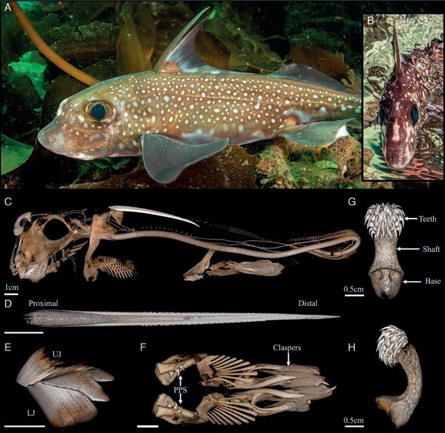 (A e B) Fotografia de um macho adulto de H. colliei em Puget Sound. (Fotografia usada com permissão de Tiare Boyes) (C) Tomografia computadorizada de um macho de H. colliei. (D) Tomografia computadorizada de volume do espinho dorsal em vista ventral, destacando as serrilhas ao longo do espinho. (E) Representação volumétrica do bico modificado, com regiões hipermineralizadas visíveis como colunas frisadas. (F) Representação volumétrica dos cláspers e da anatomia pré-pélvica. A pélvis é cravejada com seis dentículos grandes, e os cláspers são cobertos por centenas de dentículos pequenos em formato romboide. (G e H) Segmentação do tenáculo adulto, com dentes coloridos para destacar o arranjo. Escala, 1 cm.