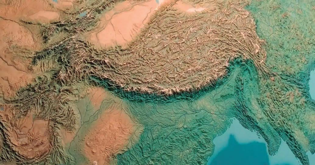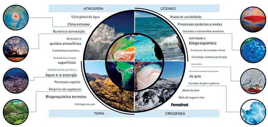 Conexões entre todas as partes do planeta — a atmosfera, os oceanos, a terra, a vegetação e o gelo.