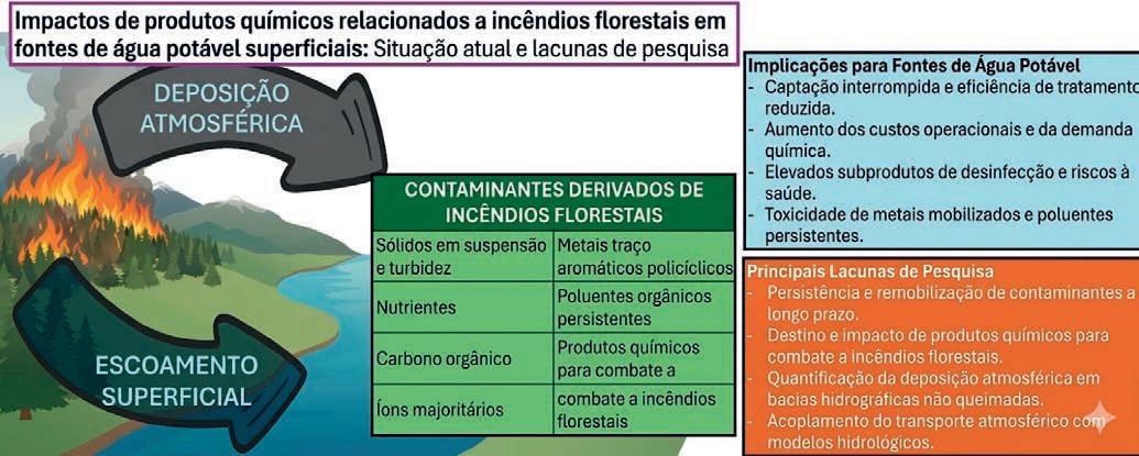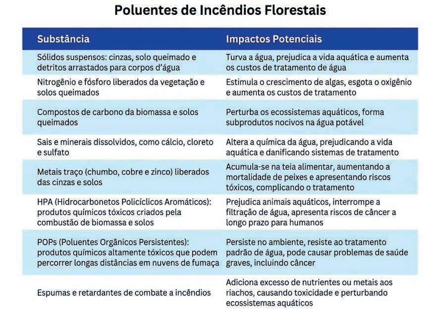 Os impactos de um incêndio florestal na água que bebemos não terminam quando as chamas se apagam; muitas vezes, eles surgem meses ou anos depois. Quando chove ou a neve derrete, sedimentos, cinzas, nutrientes, metais pesados e até produtos químicos usados no combate ao fogo (como retardantes) são levados para os rios e bacias hidrográficas. Isso compromete a qualidade da água bruta, eleva significativamente os custos de tratamento para as cidades...