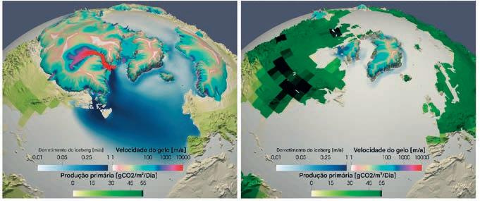 Comparação entre períodos frios e quentes: No auge da última era glacial, há cerca de 21.000 anos, as camadas de gelo cobriam grandes partes da América do Norte e do norte da Europa. Os eventos de Heinrich, durante os quais grandes quantidades de gelo fluíram da camada de gelo norte-americana para o mar, podem ser identificados pela alta velocidade de fluxo do gelo (vermelho). Isso significava que muita água de degelo também fluía para o mar (azul escuro). O gráfico inferior mostra as camadas de gelo por volta de 1850, ou seja, antes das mudanças climáticas induzidas pelo homem.