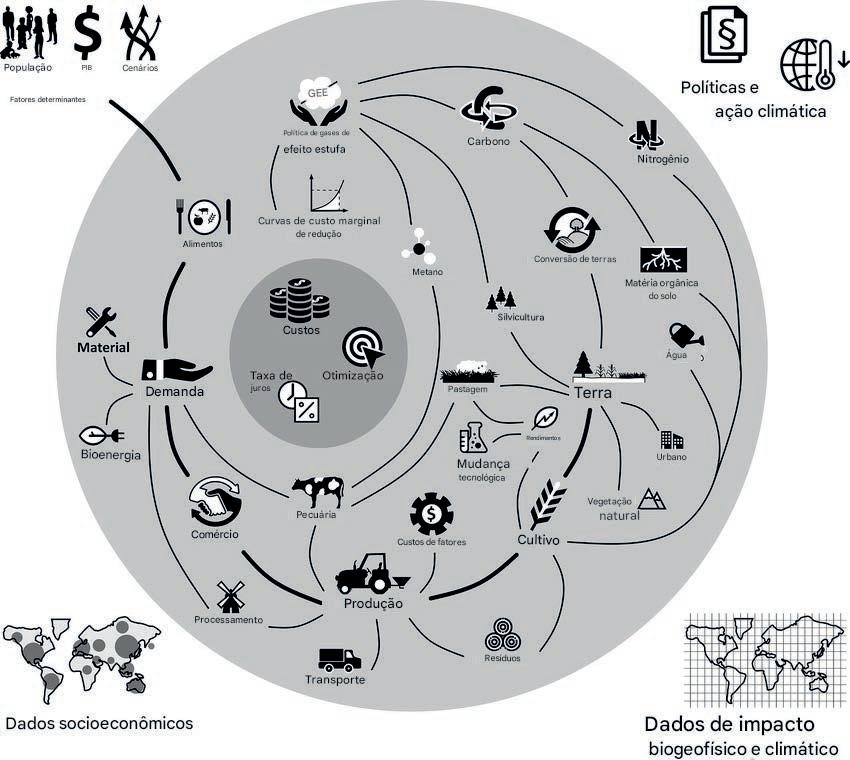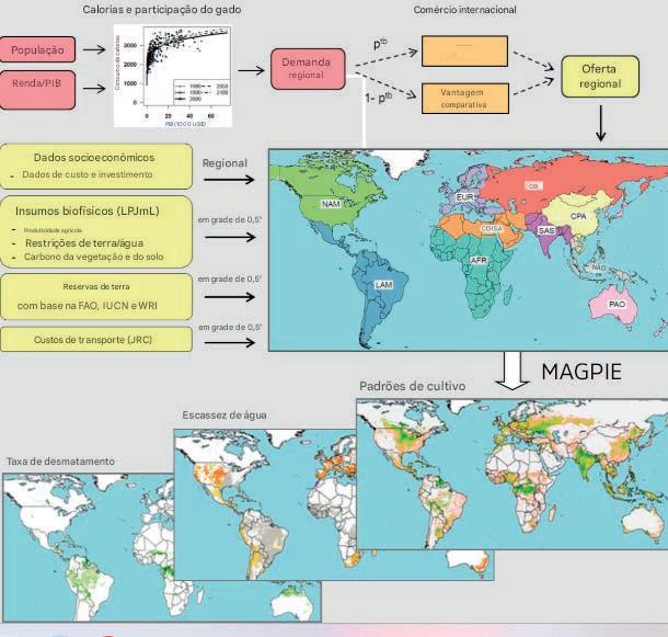 e custos de produção, bem como dados espacialmente explícitos sobre o potencial de rendimento das culturas e restrições de terra e água (provenientes do LPJmL). Com base nesses dados, o modelo deriva padrões específicos de uso da terra, rendimentos e custos totais de produção agrícola para cada célula da grade. A função objetivo do modelo de uso da terra é minimizar o custo total de produção para uma determinada demanda regional de alimentos e bioenergia. A demanda regional de energia alimentar é definida para uma população exógena em 10 categorias de energia alimentar, com base nas dietas regionais. As tendências futuras na demanda por alimentos são derivadas de uma análise de regressão entre países, baseada em cenários futuros de crescimento do PIB e da população.