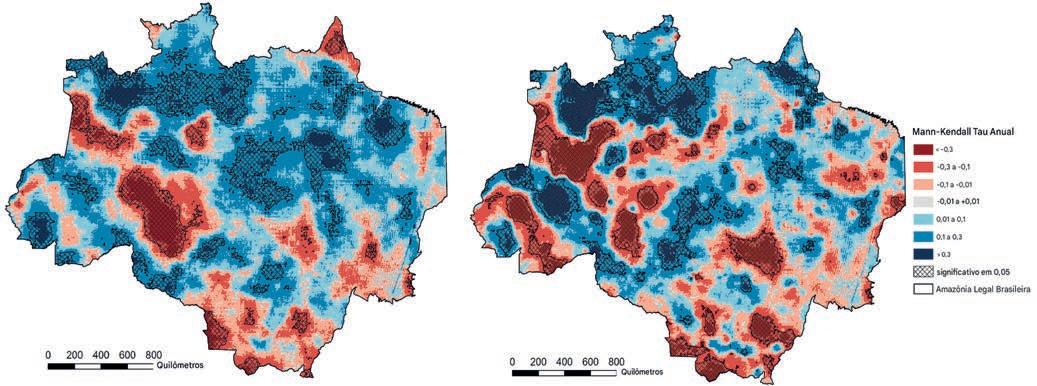 Tendências da precipitação média anual de CHIRPS (esquerda) e baCHIRPS (direita) na Amazônia brasileira no período de 1981 a 2020. As hachuras mostram tendências significativas com um nível de confiança de 5%