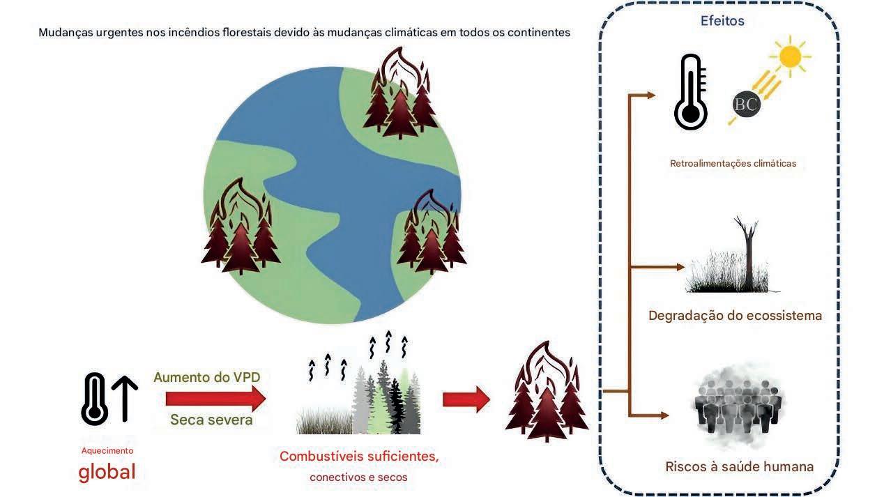 Globalmente, o número de dias com o clima perfeito para incêndios extremos (quente, seco e com ventos) quase triplicou nos últimos 45 anos, saltando de uma média de 22 dias para mais de 60 dias por ano. Os cientistas atribuem mais da metade desse aumento às mudanças climáticas causadas pela ação humana. O maior problema dessa “sincronia” climática é que as temporadas de incêndio estão se sobrepondo em vários países ao mesmo tempo...