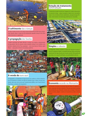 A propagação das favelas O rápido crescimento das favelas dificulta os avanços com relação ao abastecimento de água potável. Além do consumo, muitos moradores utilizam os rios também como banheiro e depósito de lixo. Para a população – como nesta favela em Manila, capital filipina – a água pode ser fonte de uma perigosa epidemia.