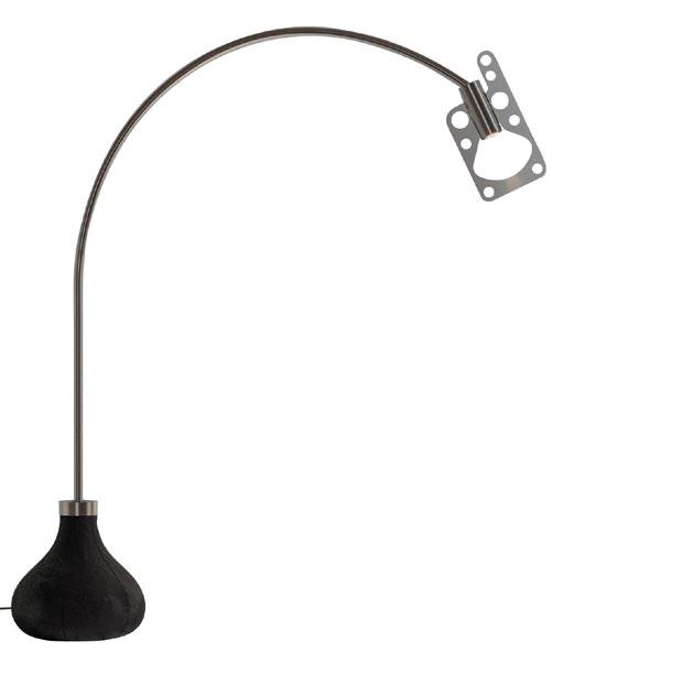 24. FLEXIBILIDADE. Com desenho de Gabetti e Isola para a Axolight, a BUL-BO contrapõe o natural da base em couro ao industrial da haste flexível em alumínio que conduz à forma metálica da lâmpada, permitindo várias inclinações.