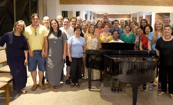 pelo mesmo propósito: servir através da música. A equipe tem presença constante nas missas e também nas atividades da paróquia. Participa da Feira da Fraternidade, canta em eventos de Natal e, mais do que isso, faz parte da vida comunitária. “Eles não estão só nos palcos, estão nas barracas, nas missas, nas ações sociais. São pessoas que vivem a fé no dia a dia e o canto é uma extensão disso.”
