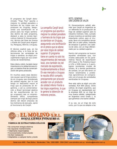 El programa de Cargill denominado “Trigo Plus” apunta a mejorar la calidad panadera y harinera de los trigos que se producen en Uruguay, asegurando una bonificación en el precio para los trigos sembrados dentro de este programa, destacó a esta la revista Agricultura Gabriel Di Giovannantonio, técnico del Área de Granos y Aceite de Cargill para Argentina, Paraguay, Bolivia y Uruguay. El técnico explicó que, en los últimos años, a la hora de seleccionarse las variedades de trigos a sembrar, se eligió principalmente trigos por sus condiciones de rendimientos. Este criterio, indicó, ha dado menor importancia a la calidad de esos trigos y al destino final de comercialización del grano producido. En muchos casos esas decisiones causan que el trigo producido en Uruguay sea considerado de calidad regular, por lo cual tenga un descuento mayor al trigo que es producido en Argentina, y así su comercialización a Brasil (principal destino de las exportaciones de trigo uruguayo) sea un emprendimiento difícil, compitiendo siempre por trigo de bajo precio dentro del blend (mezcla) de los molineros de ese país, opinó el funcionario de Cargill.