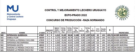 La Cabaña “La Esperanza” de Javier Bárcena nuevamente a la cabeza en este concurso de producción donde la Sociedad de Criadores de Ganado Normando impulsa y apoya a los efectos de contar con información fidedigna de la producción de las vacas que concursan en este Prado.