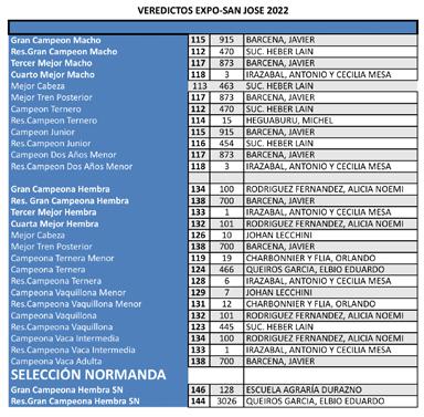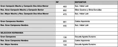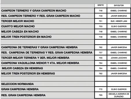 Se reproduce a continuación el cuadro de la competencia que contó con 7 animales provenientes de 4 cabañas.