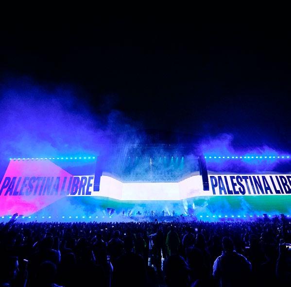 La interpretación de la banda y la respuesta del público generaron un ambiente cargado de nostalgia y sentimiento, con la piel erizada y la emoción a flor de piel. Más adelante, la canción “Paz” llevó un mensaje político y social, proyectando la bandera de Palestina acompañada del texto “Palestina libre”, haciendo un alto reflexivo dentro del espectáculo. El público acompañó con palmas la melodía de “No hay mal”, mientras que “Karmadame” fue recibida con gritos y cantada de principio a fin, reafirmando su estatus como uno de los himnos más coreados de la banda. Zoé también sorprendió con la interpretación de sus más recientes sencillos: “Campo de fuerza” y “Rexsexsex”, ambos lanzados este año, dejando entrever la posibilidad de un nuevo álbum que fusiona la identidad sonora de la banda con