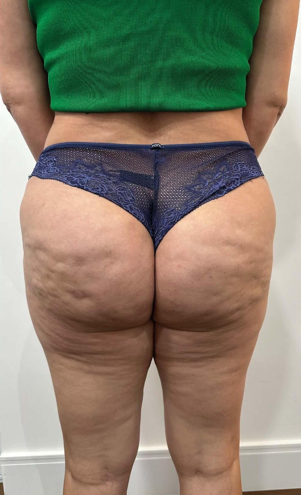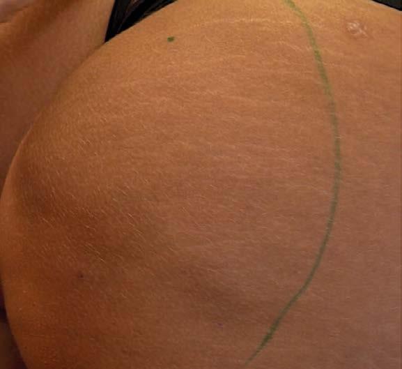 Para a médica, a reconstrução exigiu uma associação de técnicas: primeiro, liberar as retrações do tecido, uma mini-lipo para retirar o excesso de gordura, e, por fim, a aplicação do PMMA para criar a nova projeção e devolver o contorno.