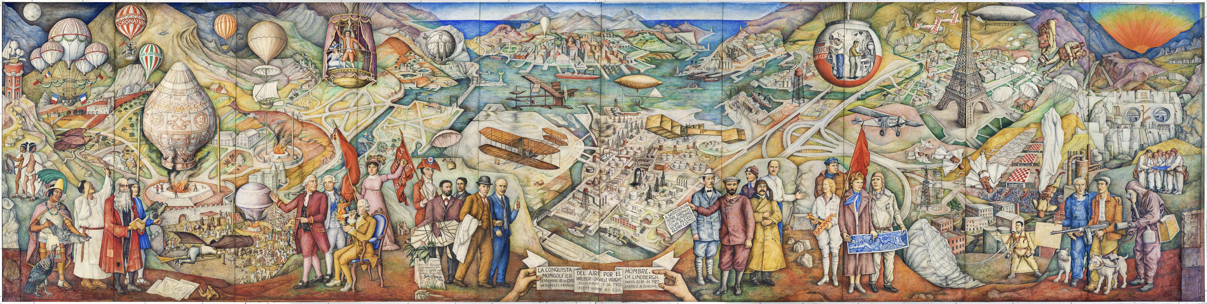 Resuelto ese asunto, O’ Gorman inició su trabajo. Tenía en su mente la creación de un tríptico. Una de mayor tamaño que los otros dos y que sería considerado el más importante y tendría el nombre de La conquista del aire por el hombre.