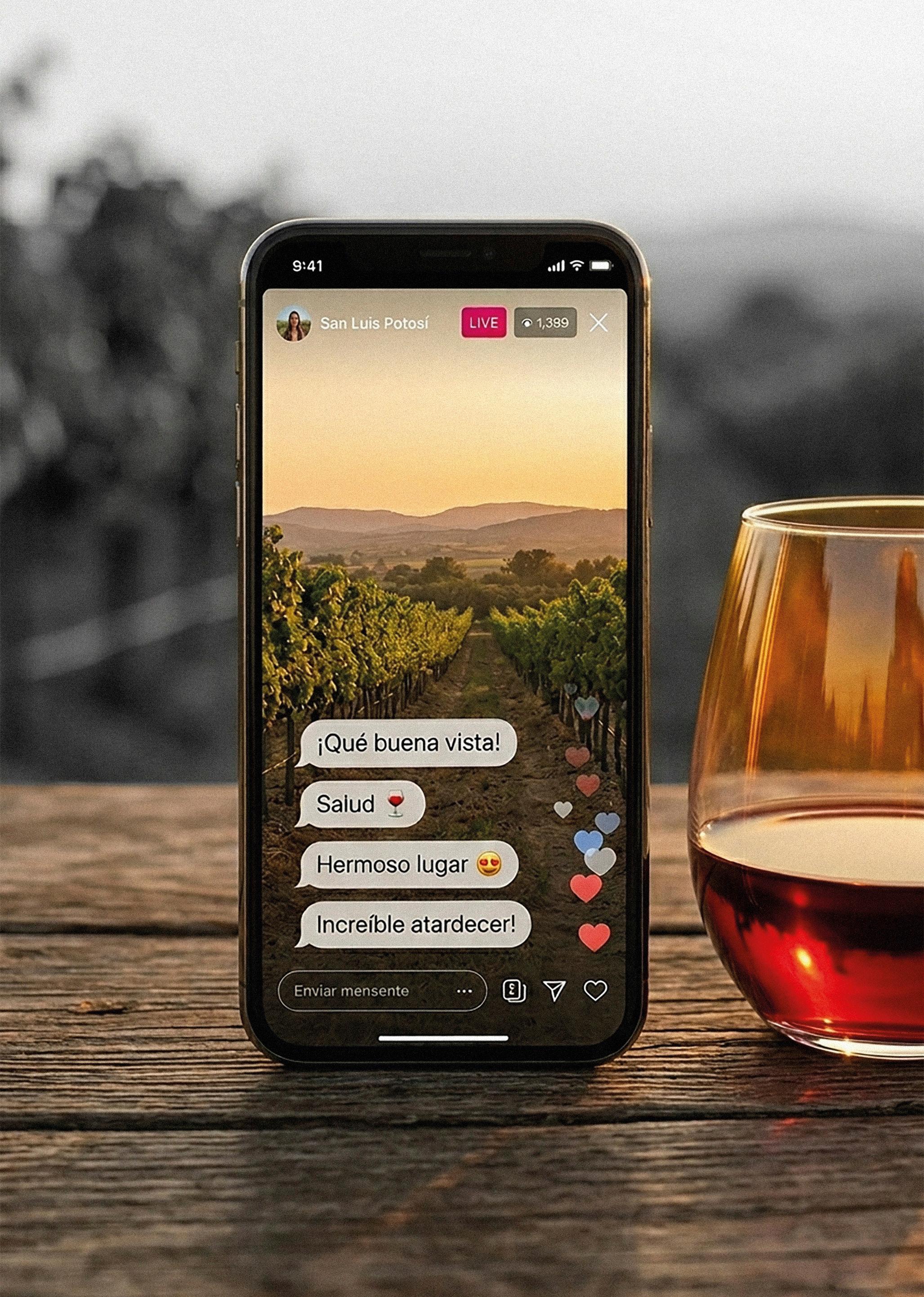 Esta transformación ocurre en paralelo al auge de regiones vitivinícolas como Baja California, Querétaro, Coahuila y San Luis Potosí, las bodegas no solo producen vino, producen relatos, publican vendimias en tiempo real, muestran el trabajo enológico, anuncian catas virtuales y convergen en los festivales de vino más importantes del país, como es el caso del FESTIVAL DEL VINO MEXICANO realizado por Revista CAVA que se lleva a cabo cada año en el estado de San Luis Potosí. El viñedo se convierte en escenario y las botellas en protagonistas de una narrativa que forma parte de historias, reels y transmisiones en vivo.