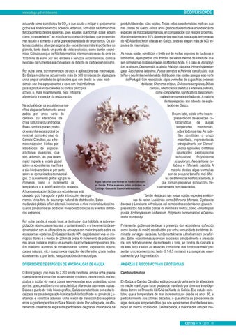 produtividade das súas costas. Todas estas características motivan que nas costas de Galiza exista unha grande diversidade e abundancia de especies de macroalgas mariñas, en comparación con rexións próximas. Aproximadamente o 85% das especies descritas nas augas temperadas do NE Atlántico foron citadas en Galiza, onde se atopan máis de 600 especies de macroalgas.