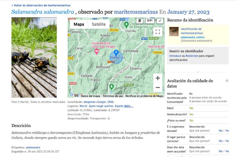 e) Criaçom de projetos “à carta”. Permite a delimitaçom de áreas de recolha de dados para um tempo e finalidade determinada, criando umha subpágina própria ◀ f) Revisom dos dados. As citas som revisadas por validadores de Natusfera. g) Em rede. Natusfera é, como iNaturalist, umha comunidade global integrada no nodo mundial de biodiversidade (GBIF.org). a) Escassa acolhida. Mesmo logo de seis anos de actividade, e ter instituiçons tam prestigiosas como o CSIC e o CREAF detrás da iniciativa, Natusfera apenas tem conseguido coalhar além da Catalunha: o volume de citas neste território (92.654) achega-se às do total das catalás de iNaturalist (362.164). Porém, o volume global (mundial) de 275.000 citas subidas a Natusfera é apenas o 0,25% do total de registos em iNaturalist, e mesmo no contexto ibérico, as 189.998 citas introduzidas a começos de Dezembro de 2022 som só o 8% das subidas a iNaturalist. b) Pequenos erros. A pesar de tomar o esquema de iNaturalist, há alguns pequenos erros e “bugs” a arranjar: por exemplo, na ficha de introduçom de dados, ademais de ter certa complexidade para ser coberta, o calendário aparez sémi-oculto umha vez despregado. c) Sem opçons para fazer itinerários e estaçons. Na app de Natusfera nom existe a opçom de fazer transectos e estaçons de tempo controlado. d) Sem identificaçom automática. Nom se aplica a identificaçom automática às imagens nem na app nem na web, como si o fai iNaturalist. e) Ausência de núcleo coordenador e dinamizador na Galiza. Se bem existem grupos de projectos coordenados, nom há umha figura ou figuras de contacto oficial de Natusfera na Galiza.
