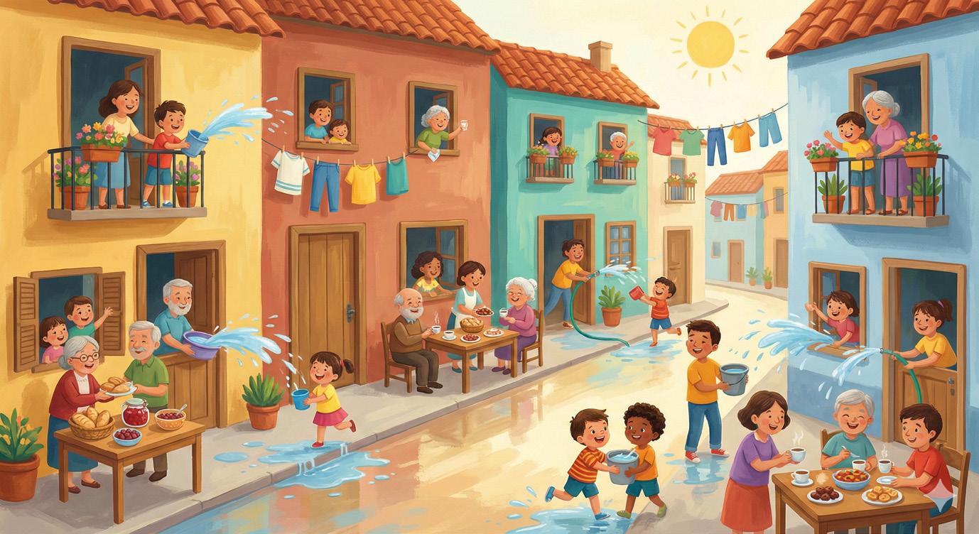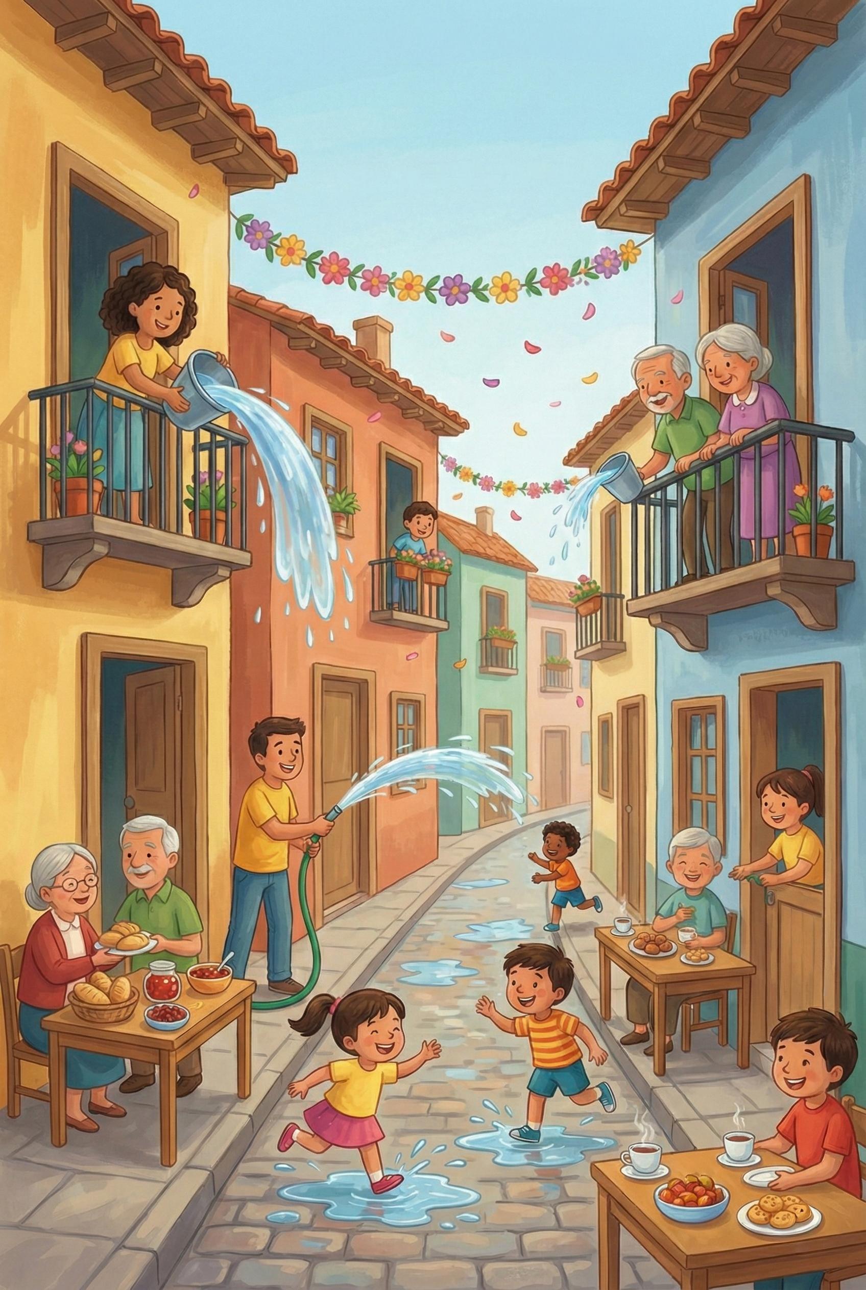 La gente miraba, aplaudía, sonreía sin empujarse. —Aquí celebramos lo que la tierra nos regala —nos dijeron—. Por eso no jugamos con agua: jugamos con gratitud.